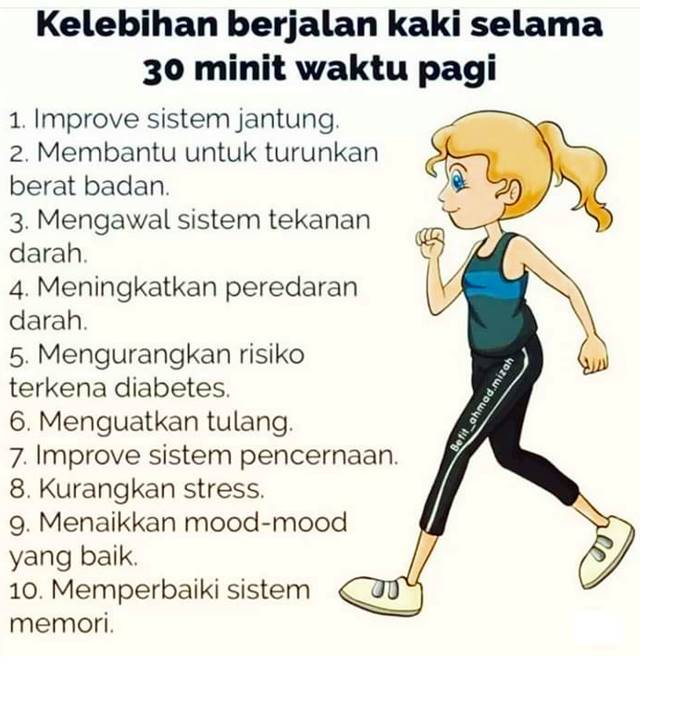 Salah satunya ialah brisk walking mampu menurunkan tekanan darah serta membantu mengurangkan risiko menghidap diabetes type 2.